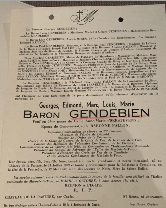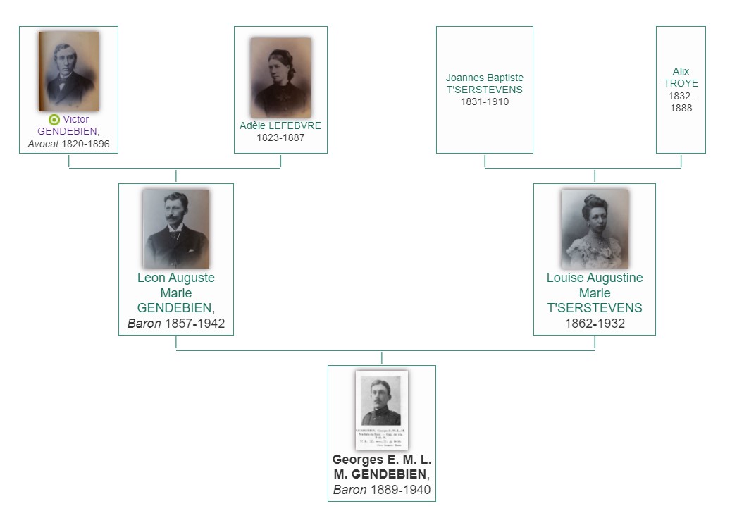 Paul Ferdinand Victor Marie GENDEBIEN, Baron 1884-1957 Marié le 14 octobre 1908 (mercredi), Acoz, Hainaut, Belgique, avec Ghislaine PIRMEZ 1889-1966